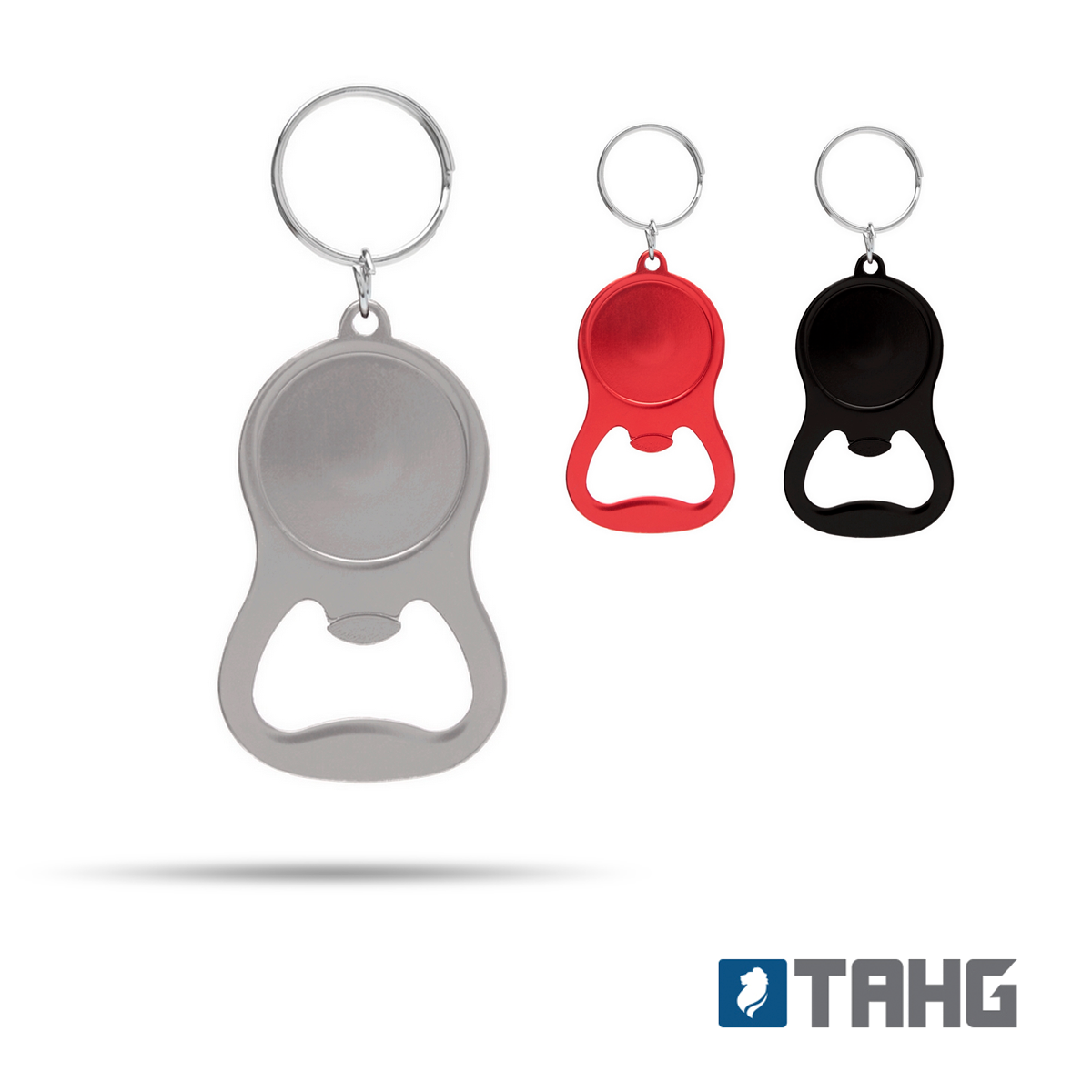 Llavero abridor tapa corona, metálico. Medidas: 4 x 6,5 x 0,3 cm. (anillo de 25 mm de diámetro).